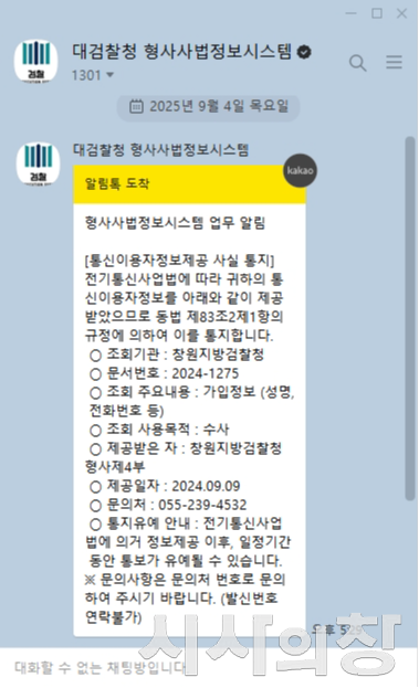 [시사의창=이태헌 기자]거창군을 비롯해 함양·합천·산청 지역 주민 수십~수백 명이 지난 4일 오후 ‘대검찰청 형사사법정보시스템’ 발신처에서 발송된 카카오톡 문자를 받아 불안과 불만을 토로하고 있다.
