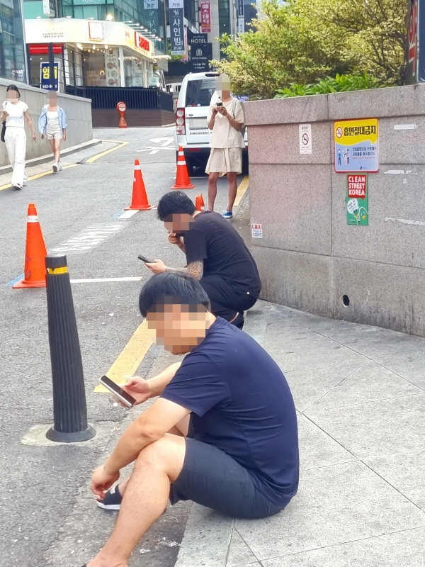 강남역 사거리에서 양재 방면으로 도보 2~3분 거리에 대로변 옆으로 좁은 골목길들이 있다. 예상대로 어김없이 흡연자들이 흡연을 하는 비공식적 흡연 장소다. 하지만 골목 곳곳에는 흡연금지와 꽁초투기 금지를 알리는 여러 개의 현수막과 CCTV까지 설치되었지만, 흡연자들은 아랑곳하지 않고 담배를 피우고 있었다. 그러던 도중 60대 후반에서 70대 초반 정도로 보이는 남성 두 명이 ‘무단투기단속’이라는 글귀가 새겨진 조끼를 입은 채 해당 골목 앞에 서 있었다. 그래서 기자는 “꽁초 무단투기 단속을 하나보다”하고 단속 장면을 사진 찍으려 준비하고 있었지만, 이상하게도 단속원들은 흡연자들을 쳐다보더니 그냥 지나치는 것이었다. 흡연자들이 너무 많아 그냥 포기하고 가는 듯 보였다.