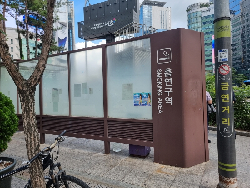 강남역 8번출구 앞에 마련된 개방형 흡연부스. 타 흡연부스와 다른 점은 보행자들의 동선과 다소 떨어져 있어 제 역할을 하고 있는 것으로 보였다.