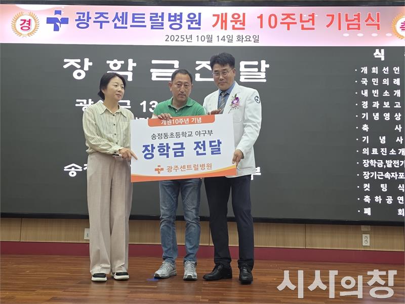 광주 시민의 건강 지킴이로 자리한 광주센트럴병원이 개원 10주년을 맞아 기념식을 열고 새로운 비전을 선포했다. 사진은 고길석 대표원장이 광주 송정동초등학교 야구부에에 장학금을 기탁 하고 있다.(사진=송상교 기자)