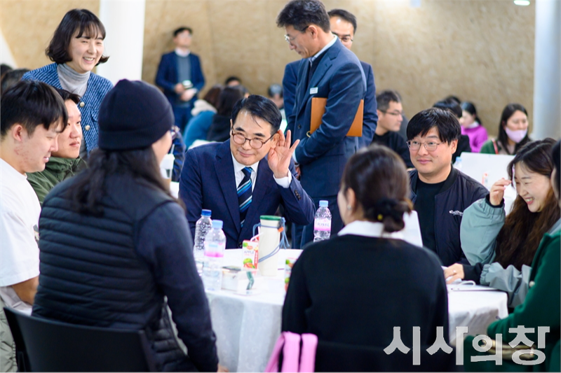 청년 크리에이터들과 함께 이야기를 나누고 있는 장충남 남해군수