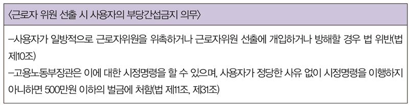 A2. 법 제10조 제1항은 “사용자는 근로자위원의 선출에 개입하거나 방해해서는 안 된다”고 규정함으로써 근로자위원 선출결과 등에 직간접적으로 영향을 미칠 수 있는 일체의 사용자 행위를 금지하고 있는 바, 입후보 방해·제한 등 특정 근로자의 당선 내지 낙선을 목적으로 하는 행위뿐만 아니라 선거관리위원회의 구성·활동 등 근로자위원 선출절차에 관련한 제반사항에 대한 의사결정에 영향을 미치는 행위까지도 금지된다 할 것으로 근참법 제11조는 이러한 행위에 대한 시정명령을 규정하고 있음. (노사협력과-239, 2004.1.30.)