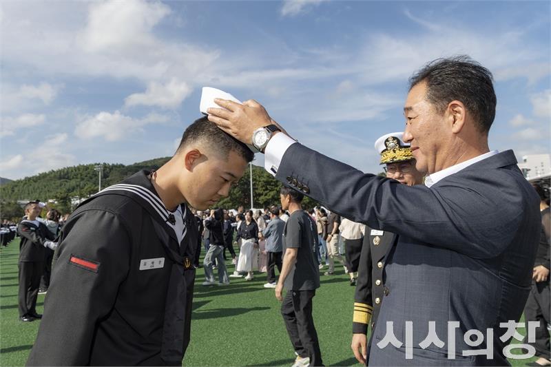 해군교육사령부는 10월 17일(금), 기초군사교육단 연병장에서 해군병 717기 수료식을 개최해 544명의 정예 해군병을 배출했다. 사진은 훈련병 가족이 훈련병에게 정모를 수여하고 있는 모습.[시사의창 = 송상교 기자]