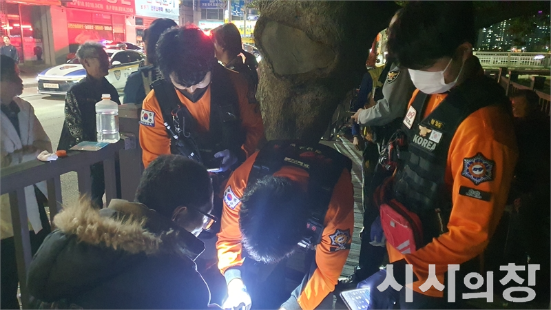 20일 밤 거창중앙교 북단 정자나무 쉼터에서 응급구조대가 피해자를 응급조치하고 있다.