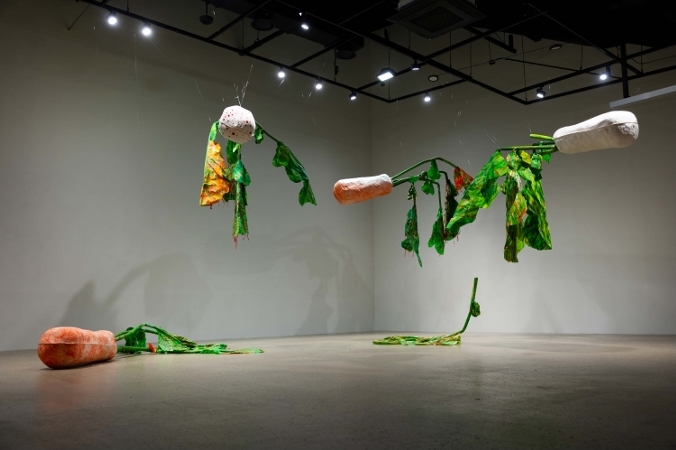 [시사의 창=이두섭 기자] 평창동에 있는 도암 갤러리에서 2025년 10월 16일(목)부터 11월 15일(토)까지 황인선 개인전 《김치팝! Kimchipopped!》을 개최한다. 황인선 작가는 한국인의 밥상에서 가장 기본이 되는 먹거리인 밥과 김치를 주요 소재로 작업을 이어오고 있다. 이번 전시는 특히 최근 몇 년 사이 김치의 질감과 색, 형태, 크기를 다각도로 실험하며 축적해온 작가의 조형적 탐구를 한눈에 확인할 수 있는 자리로 마련하였으며, 대형 설치, 영상, 회화 작품을 포함하여 약 20여 점의 작품이 출품되었다. 밥상 위 먹거리라는 소재만 놓고 보면 한국인 여성 작가로서 정체성의 발현으로 이어지는 진지한 작업을 연상하기 쉽다. 그러나 갤러리 천장에 매달린 대형 조형 작품 〈날으는 총각김치〉를 마주하는 순간, 미학적 기대는 곧 유쾌한 감상으로 전환된다. 밥상에 얽힌 개인 혹은 집단의 기억과 무수한 서사를 품은 김치라는 이미지가 곧 경쾌하고 키치한 색감을 입고 어디서든 쉽게 수용 가능한 하나의 팝 아이콘으로 변모하는 지점이다.