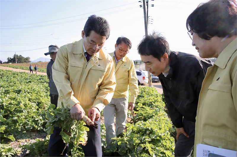 권 군수가 첫 번째로 방문한 박병양 농가는 가을무 59,400㎡를 재배 중이다. 두 번째로 찾은 신성일 농가는 가을배추 6만 6000㎡를 재배하고 있다. 두 농가 모두 “올가을 장마와 이상 고온으로 방제를 해도 무름병이 멈추지 않는다”며 깊은 한숨을 내쉬었다. 방제 효과가 미미한 채 병해충이 퍼지자 수확량 감소, 품질 저하, 출하 지연 등 삼중고에 시달리고 있는 것이다. 이들은 “농가의 힘만으로는 감당이 어렵다”며 정부의 직접 지원을 호소했다.