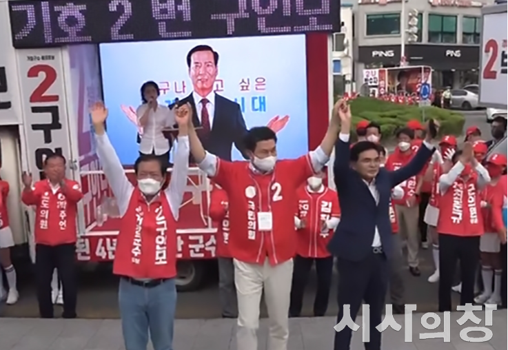 2022년 군수선거 유세에서 김태호의원(가운데)이 구인모 최기봉 후보 손을 맞잡고 있다.