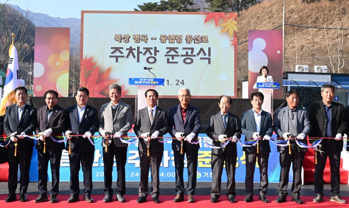 거창군은 지난 24일 북상면 병곡리 주차장에서 구인모 군수와 도·군의원, 지역 단체장, 주민 등 100여 명이 참석한 가운데 북상 병곡~동엽령 등산로 주차장 준공식을 열었다. 준공식은 북상면 풍물패 식전 공연에 이어 경과보고, 기념사·축사, 색줄 자르기, 기념촬영 순으로 진행됐다.
