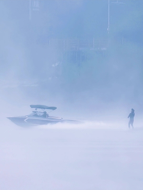 물안개 가득한 이른 아침, 우륵대교 아래서 한 남성이 수상스키를 타고 있는 모습.