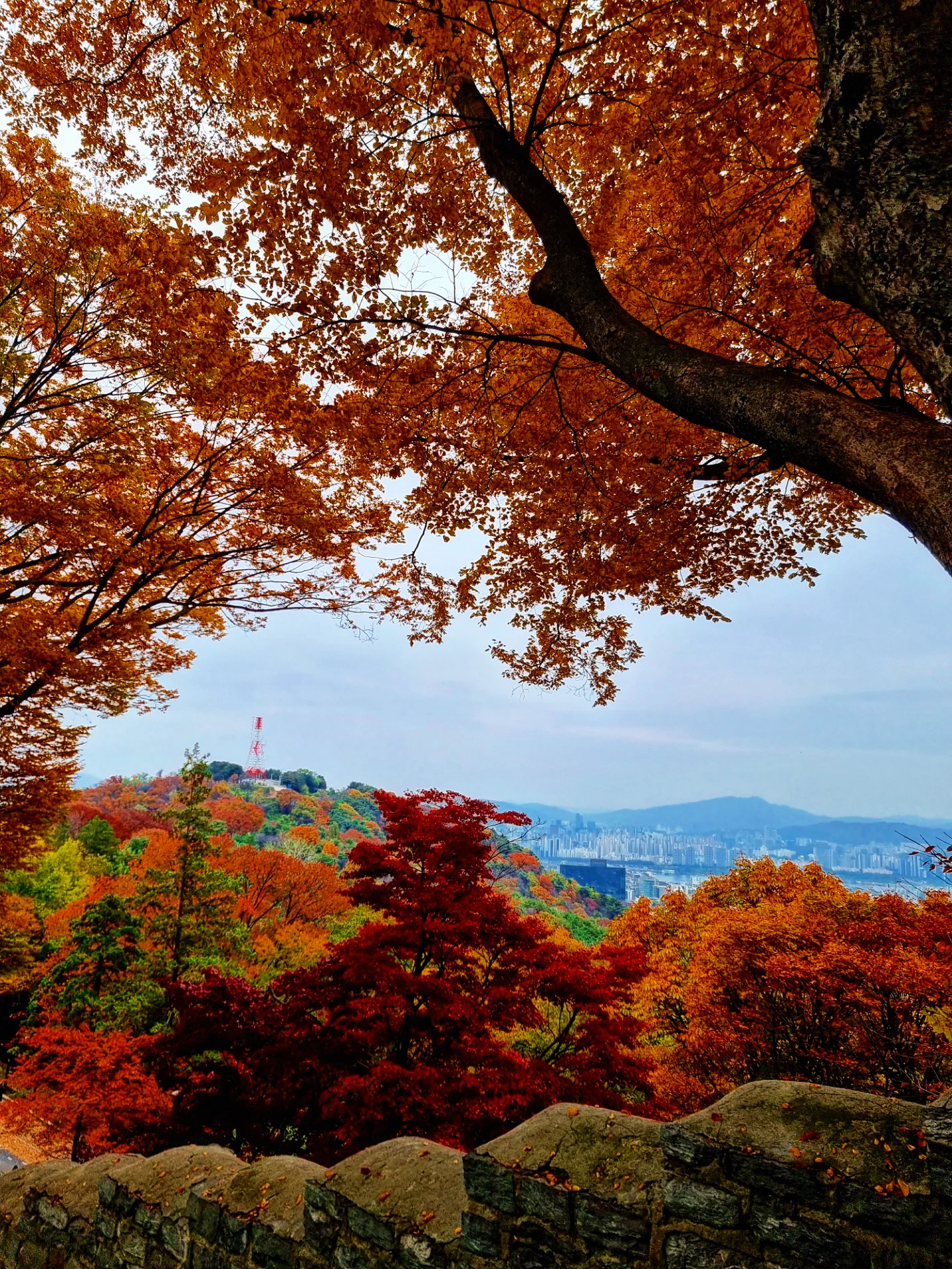 N서울타워 전망대에서 바라본 남산. 알록달록 가을 색이 짙에 스며든 모습이 장관이다.